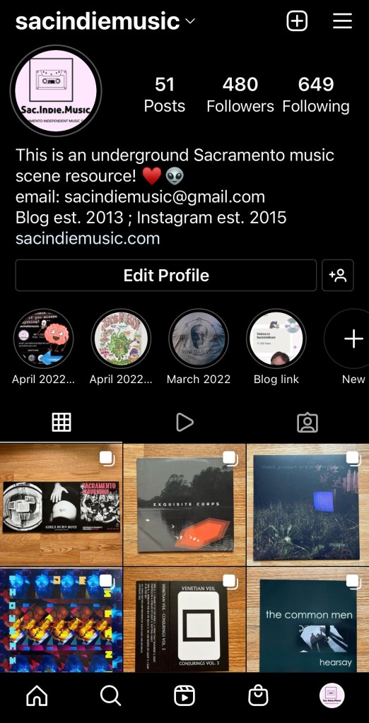 Alas, Social media is what we have, and I am trying to fill a gigantic void by utilizing it even though it sucks that the platforms are all owned by billionaire bros. My hope with the SacIndieMusic Instagram project thingy is to try and create a place where people can converge and discover others in the music scene, and also remember the thriving scene of the past. I’ve set out on a mission of sorts to scour the depths of Instagram and share everything I come across related to local music shows, the photographers of the scene, the other locals sharing show information, and sharing venue information. All of that on top of the main point which is sharing who the active bands in the scene are, and the physical copies of the music created by current and past bands. So if you visit the Instagram project page you will see the music from my own personal collection. These are all albums from local bands that I have collected over the years, and also ones that I’ve recently brought into my collection. Documenting the past and present scene is not only important, but also fun because people can find new music to listen too, or remember ones from the past. Now just to note here, and before you go picking on me, my collection is not at all very large! I do not own everything everyone has ever created, LOL! At some point I suspect I will need to reach out to others to submit photos of what they own and help contribute to this project to keep it going.