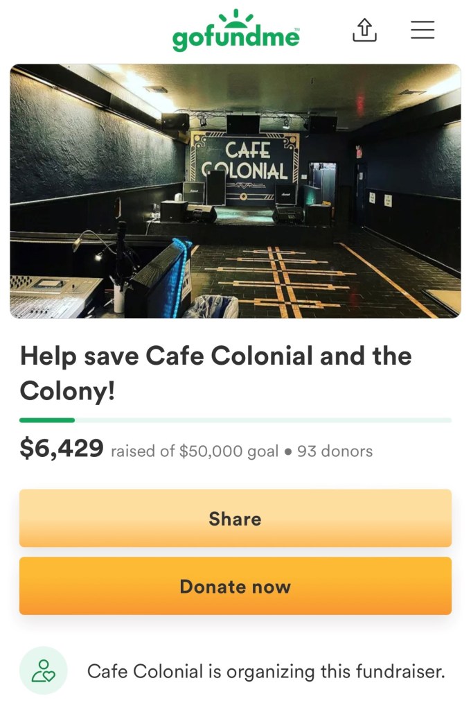 Please help; we ALL have lost enough. Let’s unite as a community and help save the Café Colonial and The colony! If you can’t donate, go to a show, eat dinner here, or please consider sharing their fundraiser site!